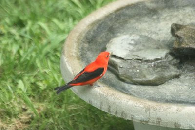 He is a rocket, a smooth scarlet packet of beauty. And this bubbly Bird Spa has lured him out of his forest fastnesses.