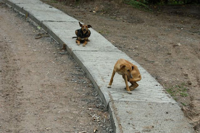 So I amuse myself and try to take my mind off my periodically rising gorge by shooting snapshots out the windshield. It's also a good place to spot birds. On this morning we were headed to Cerro Azul Meambar National park, a fabulous montane forest habitat just full of great birds. First, though, we had to negotiate an extremely steep road that was in the process of being paved. They only pave two tracks, where your tires go. I'm not sure what the advantage is--using less cement? It seems like having to make four forms would cancel that out, but what do I know? These dogs figured we weren't going to make it for awhile, so they were free to rest on the track.
